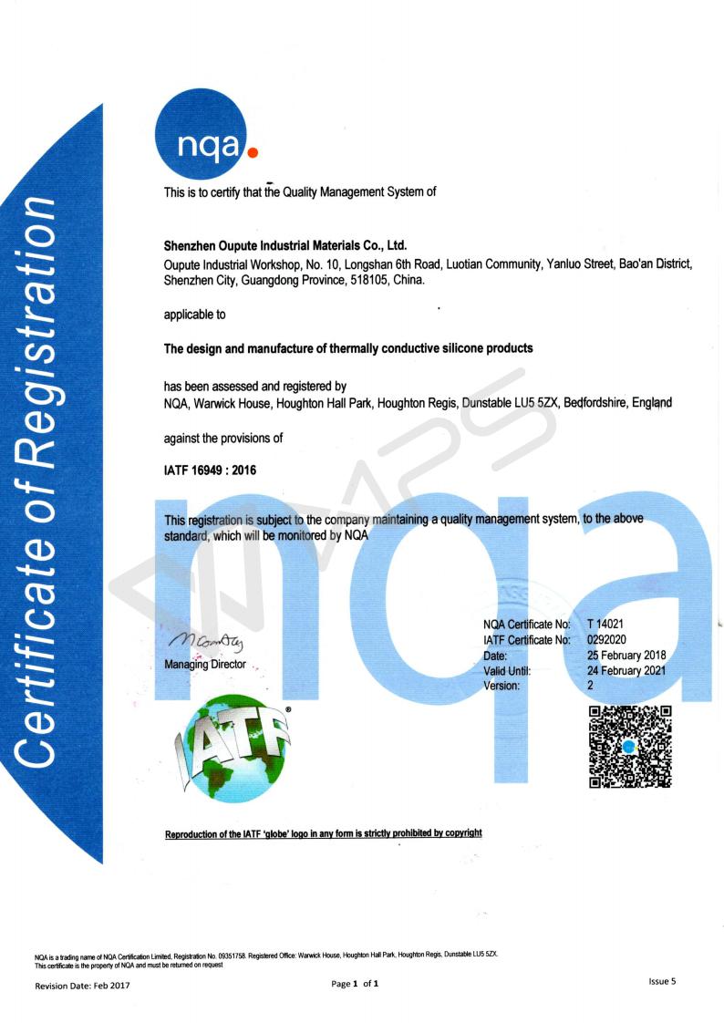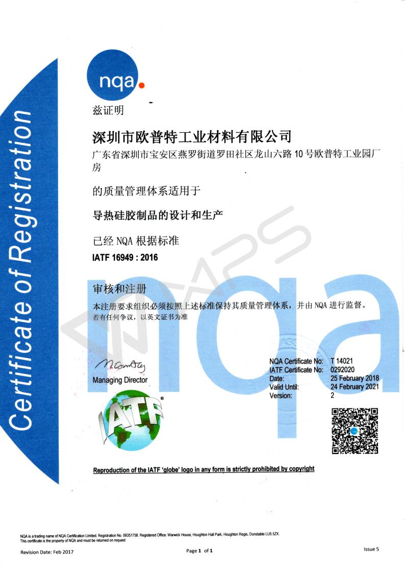2018年1月,NQA認(rèn)證機(jī)構(gòu)對我公司IATF16949質(zhì)量管理體系進(jìn)行了為期3天的現(xiàn)場審核,經(jīng)過層層嚴(yán)格把關(guān),審核組認(rèn)為深圳市歐普特工業(yè)材料有限公司的各項(xiàng)管理符合IATF16949的要求。2018年3月27日,NQA認(rèn)證公司正式給公司頒發(fā)了IATF16949認(rèn)證證書,這是公司繼2011年取得ISO9001質(zhì)量管理體系認(rèn)證、2017年取得ISO14001環(huán)境管理體系后,公司在體系管理與建設(shè)方面取得的又一重要進(jìn)展。該證書的取得,標(biāo)志著公司的導(dǎo)熱硅膠獲得了進(jìn)入汽車市場領(lǐng)域的綠色通行證,為公司積極開拓汽車用硅膠市場奠定了堅(jiān)實(shí)的基礎(chǔ)。