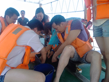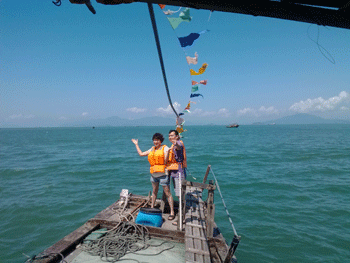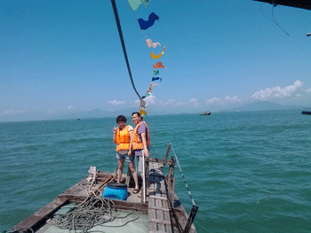 第二天,公司又組了海上捕魚(yú)活動(dòng),,于是我們?cè)僖淮翁ど萧~(yú)船,享受著大海的擁抱和飄逸的海風(fēng),讓我們每一根神經(jīng)都放松到了極點(diǎn),這時(shí),膽大的兩位同事還在船頭上演了一段朱麗葉和羅密歐.